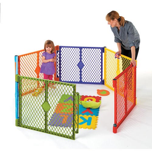The Superyard Colorplay, available exclusively at ToysRUs.com and BabiesRUs.com is a fun, stimulating play yard for kids ages 6-24 months. All moms will appreciate this play yard for its ability to keep your child safe in a colorful environment that wont slip or scratch your floor. The yard sets up in seconds and can be used inside or outside. Inside it can be used on any surface including carpet, hard wood, tile, or linoleum. Outside it works great in the grass or on the beach. The Superyard is lightweight and portable and with its convenient carry handle can be taken just about anywhere. The product includes 6 - 30 wide panels that are 26 high, and when set-up encloses an area of 18.5 square feet. With the optional 2-panel extension kit the play yard can be expanded to a whopping 34.5 square feet. A proven product for well over a decade, the Superyard Classic and Colorplay are must haves for moms with babies on the move. Made in the USA.Play mat not included.